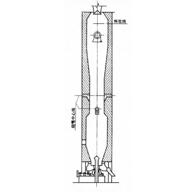 (2)鍛燒帶內(nèi)徑收縮的圓筒形豎窯:為克服上述缺點(diǎn),可將煅燒帶內(nèi)徑略加收縮,這樣可減少物料與窯壁之間的縫隙,從而使氣體沿窯截面較為均勻分布。對使用汽化冷卻爐壁的豎窯,還可使周邊物料在下沉過程中有可能向內(nèi)翻動,從而改善物料的煅燒條件,減少欠燒品。