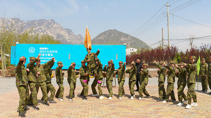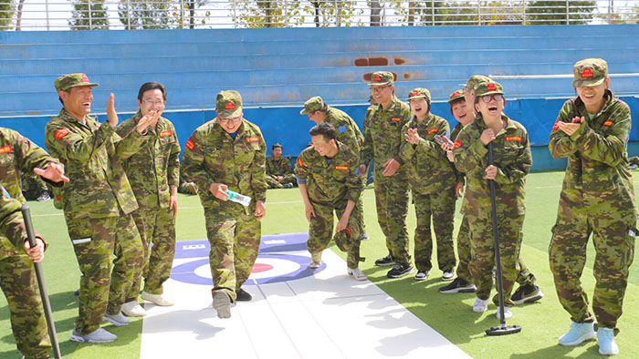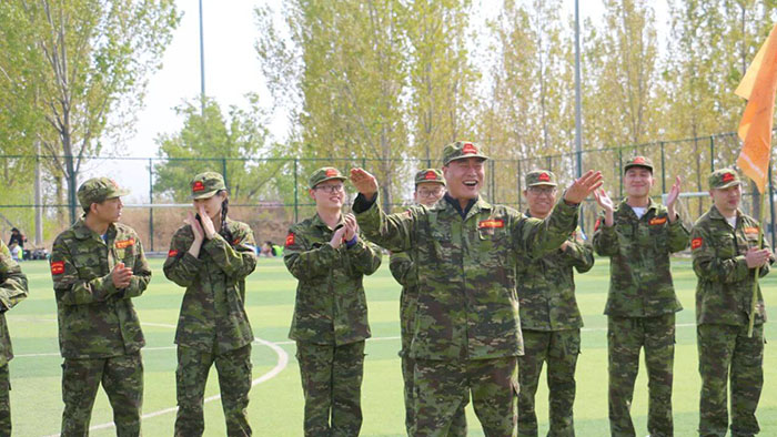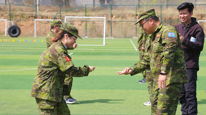 開訓(xùn)前,在破冰啟航環(huán)節(jié)——【智勇通關(guān)】項(xiàng)目中,每組選一個(gè)大魔王來防守別隊(duì),該隊(duì)隊(duì)員依次挑戰(zhàn)大魔王,石頭剪刀布定輸贏,贏了直接通過,輸了轉(zhuǎn)一圈,回來接著挑戰(zhàn),再輸即增加圈數(shù),直到全部隊(duì)員通過。大家把團(tuán)隊(duì)當(dāng)成了自己的“城堡”,在“對抗魔王”中,每個(gè)隊(duì)員都拼盡全力,期待被幸運(yùn)女神光顧,期待團(tuán)隊(duì)能盡早完成任務(wù),大家的歡笑聲、喝彩聲灑滿了訓(xùn)練場。