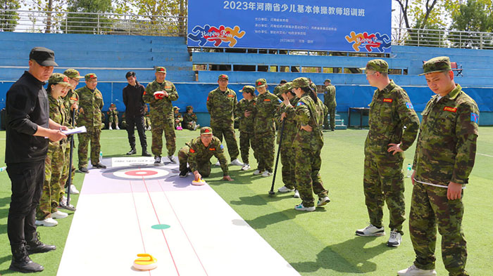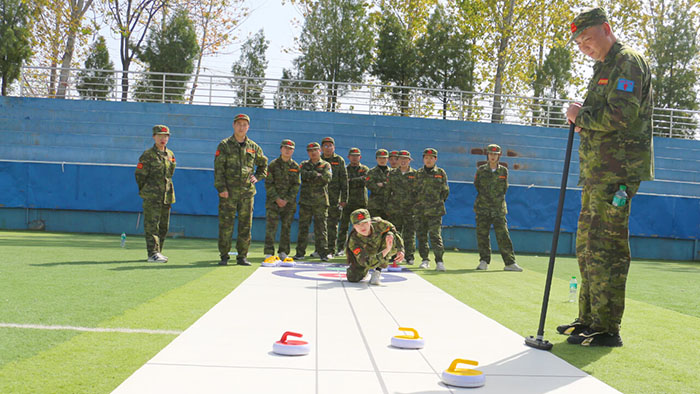 在【旱地冰壺】項(xiàng)目中,八個(gè)小組的隊(duì)員們一邊商榷對敵戰(zhàn)術(shù),一邊進(jìn)行任務(wù)分配。隨著一聲哨響,兩個(gè)賽隊(duì)同時(shí)開賽。隊(duì)員們?nèi)褙炞ⅰ⒛耢o氣,向前邁步?jīng)_刺,揮動(dòng)手臂擲壺,冰壺按照隊(duì)員們設(shè)想的路線擊打到對方的冰壺,使其滑出得分圈并穩(wěn)穩(wěn)地停留在中心點(diǎn),成功得分,大家歡呼雀躍,圍觀隊(duì)員們也紛紛叫好,掌聲、歡呼聲此起彼伏,好不熱鬧。