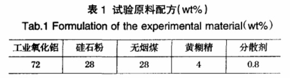 試驗(yàn)以工業(yè)氧化鋁、硅石粉為主要原料,外加無(wú)煙煤,以黃糊精為結(jié)合劑,另外加少量分散劑。試驗(yàn)基本配方如表1所示。其中工業(yè)氧化鋁的相組成為:70-80%為γ-Al2O3,5-10%為α-Al2O3,5-10%為三水鋁石。