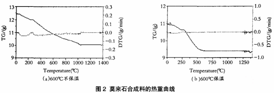 由于DSC-TG分析的測(cè)量用料量大多≤100mg,并且要磨成細(xì)粉。這種實(shí)驗(yàn)方法很難代表混合料實(shí)際的情況,且缺乏均勻性和代表性,從動(dòng)力學(xué)上也不能反映澆注料加熱過(guò)程的實(shí)阮變化情況。目前對(duì)于尺寸和質(zhì)量大的試樣,只能通過(guò)試樣加熱前后質(zhì)量的變化來(lái)表征總的反應(yīng)情況。用整體的樣塊大試樣加熱更接近真實(shí)。大試樣熱重儀對(duì)烘干后的試樣進(jìn)行熱重分析,測(cè)定室溫至1400℃過(guò)程中重量的變化,結(jié)果如圖2(a)所示。由圖可知,在連續(xù)加熱不保溫的情況下,質(zhì)量一直到1100℃才保持穩(wěn)定。根據(jù)DSC-TG及大試樣熱重分析結(jié)果,混合料在1200℃以上均可生成莫來(lái)石,只是莫來(lái)石的生成速度和轉(zhuǎn)化率隨溫度不同而會(huì)有所差異。本工作的主要目的是合成具有微孔結(jié)構(gòu)的莫來(lái)石骨料,既要求合成料有一定的氣孔率,孔徑小、體密輕,又要求其強(qiáng)度高,即要有理想的莫來(lái)石轉(zhuǎn)化率,同時(shí)還要兼顧煅燒設(shè)備投資、生產(chǎn)成本等,因此摸索理想熱處理制度對(duì)本工作而言至關(guān)重要。