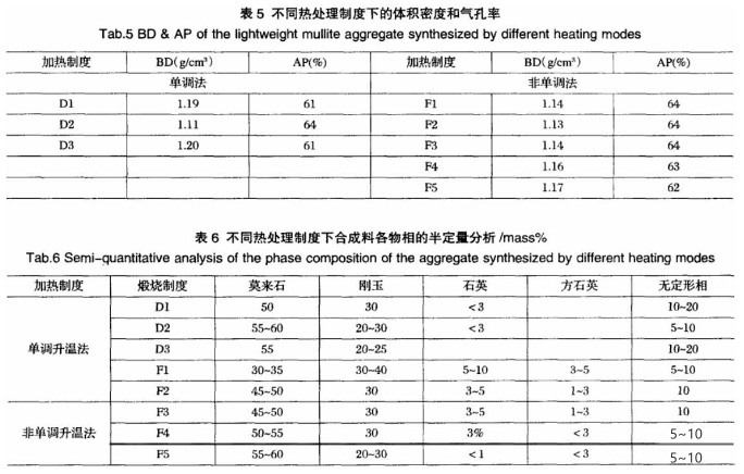 兩系列不同熱處理制度下輕質(zhì)莫來(lái)石合成料的體積密度和顯氣孔率如表6所示。