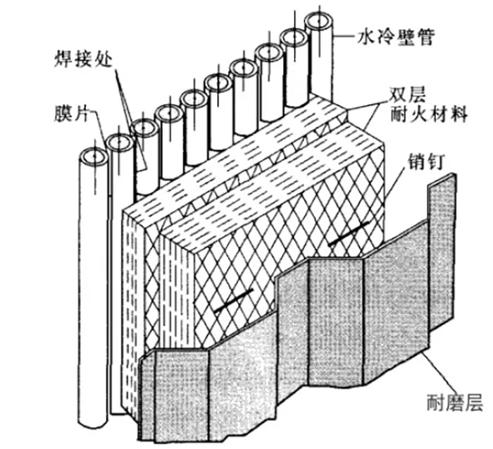 如圖1所示,為循環流化床鍋爐燃燒室下部水冷壁管上耐磨澆注料的施工工藝,耐磨材料是由焊在管子表面上的金屬銷釘固定。由于該區域為燃燒室下部密相區,其物料濃度很高,混合及湍流流動非常強烈,所以磨損非常嚴重。為了防磨,在下部密相區須襯有一定厚度的耐火、耐磨澆注料。