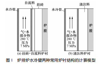 國(guó)內(nèi)外爐排爐在水冷壁內(nèi)襯結(jié)構(gòu)設(shè)計(jì)上有較大差別,國(guó)外爐排爐水冷壁內(nèi)襯結(jié)構(gòu)為鰭片(扁鋼)掛釘+SiC掛磚+SiC自流料填充密封,簡(jiǎn)稱膜式壁結(jié)構(gòu);國(guó)內(nèi)則為水冷管錨固釘+SiC澆注料結(jié)構(gòu)。不同的爐襯材質(zhì)和結(jié)構(gòu)對(duì)水冷壁內(nèi)襯傳熱有較大影響,目前尚未見爐排爐水冷壁內(nèi)襯熱傳導(dǎo)研究報(bào)道。