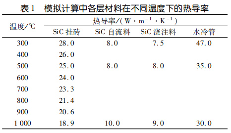 水冷壁內(nèi)襯的熱傳導(dǎo)性能需要與爐況相匹配,既要盡可能多地將熱量傳導(dǎo)出去發(fā)電,又要保證一通道出口溫度不低于 850℃。模擬計(jì)算設(shè)定耐火材料熱導(dǎo)率恒定,暫不考慮使用過程中耐火材料組成變化對(duì)熱導(dǎo)率的影響和爐襯表面積灰對(duì)爐襯熱傳導(dǎo)的影響也不考慮掛釘和錨固釘對(duì)熱傳導(dǎo)的影響。進(jìn)行模擬計(jì)算時(shí),水冷壁內(nèi)襯各工作層選取的熱導(dǎo)率見表1。