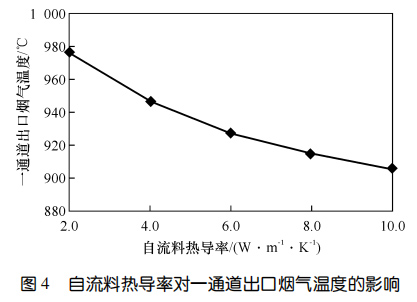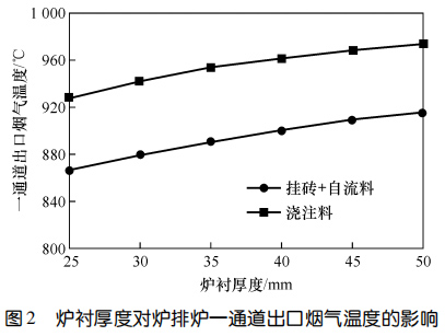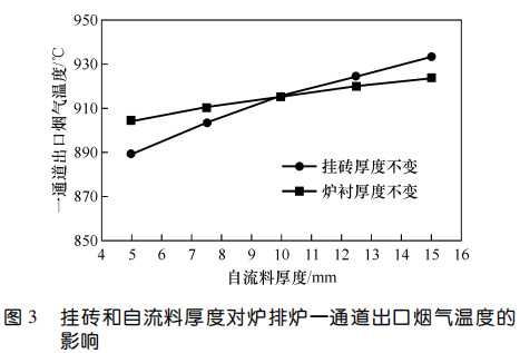 2、對(duì)于掛磚+自流料爐襯,掛磚厚度不變時(shí),自流料厚度越大,一通道出口煙氣溫度越高;爐襯總厚度不變時(shí),掛磚越厚、自流料層越薄,一通道出口煙氣溫度越低;爐襯各工作層厚度固定時(shí),一通道出口煙氣溫度隨自流料熱導(dǎo)率的升高而降低,通過調(diào)整自流料熱導(dǎo)率,一通道出口煙溫差值可達(dá) 70 ℃。
