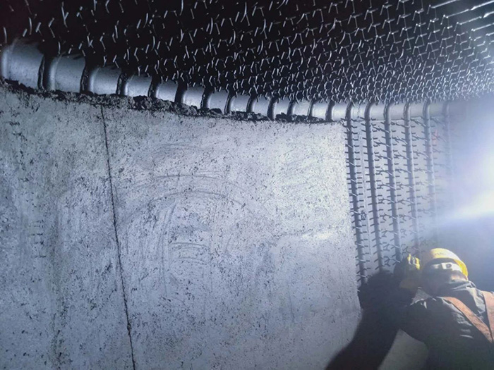 考慮到以上磨損的特點、耐磨材料的物理性能及施工特點,一般采用單層或多層耐磨耐火材料的敷設(shè)。單層敷設(shè)的部位包括水冷壁、屏式受熱面、水冷隔墻、雙面水冷壁、汽冷分離器等薄襯里處,用φ6或 φ10 的圓柱銷釘( 或 Y 型 V 型銷釘) 將耐磨耐火澆注料支撐在管壁煙氣側(cè)。薄襯里更能經(jīng)得起鍋爐起停時的快速熱沖擊,同時, 為增強其剛性及沖擊能力,需在澆注料中增加不銹鋼纖維。厚襯里分為兩層或三層,煙氣側(cè)為耐磨耐高溫的耐磨